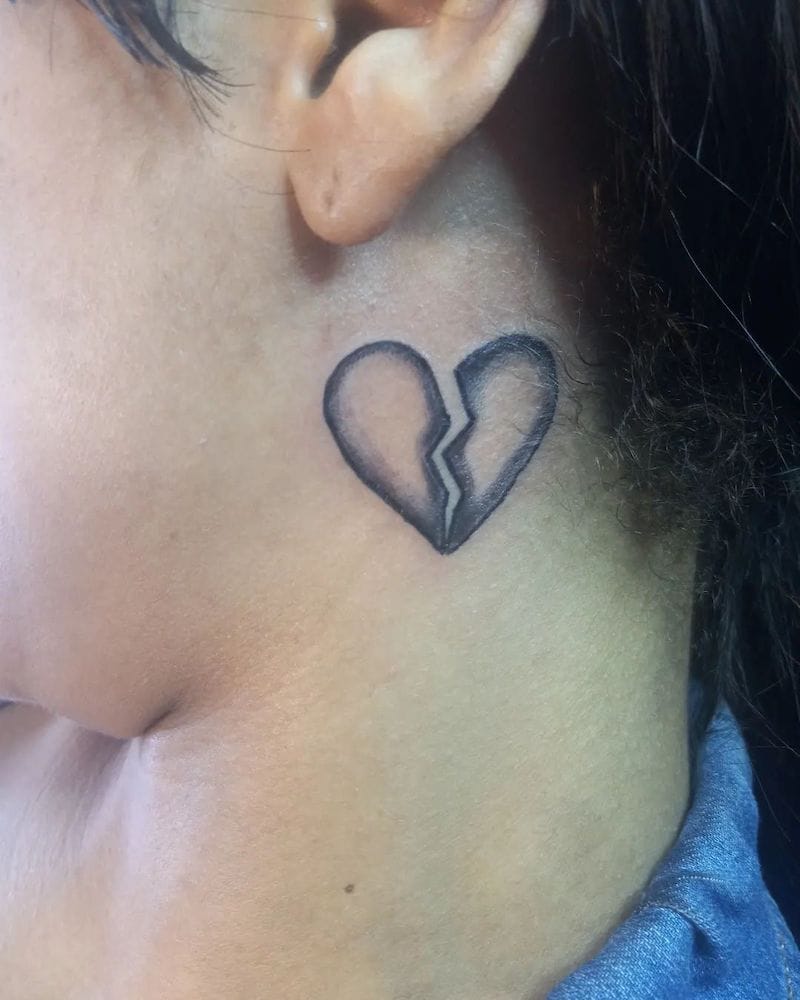 A tiny little broken heart tattoo on the back of the neck just under the hair is cute and easily concealed when necessary. The murkier version of the universal symbol of love a half heart or broken heart symbol typically represents loss of a loved one or unrequited love. The tattoo may symbolize a lot of things one.